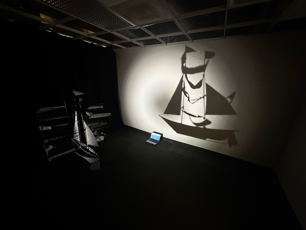 “Ghost Ship” plays upon and automates the low tech special effects of childhood created by making shadows on the wall. In contrast to the special effects we find in movies, augmented reality, and virtual reality, nothing in the installation is simulated, but rather everything is laid bare for the viewer. The McCoys often use electronics to create special effects in real space, creating live animation out of everyday objects and machines.