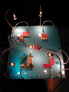 Soft Rains consists of multiple platforms. Each platform represents a familiar cinematic archetype or genre rendered in miniature (60s Arthouse, 70s horror etc). The miniature ‘heroine’ of the work, clad in a distinctive red dress, is pictured in each of the sets. The live feed from each video camera is connected to a computer-based video sequencer, which switches from one camera to another to create an edited sequence appearing as a large scale projection.