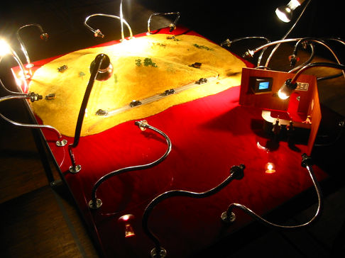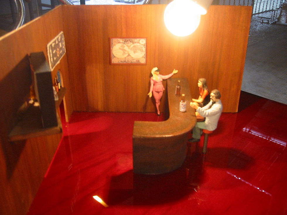 Each of these tabletop miniature kinetic sculptures involves two linked narratives. In At the Bar, a small-scale recreation of Bonnie and Clyde is portrayed. The other is a tableau portraying the artists themselves in the act of watching the film on a small- screen at a bar: a live video feed of the cinematic recreation appears on their screen. In the gallery space, a video sequence cuts back and forth between images of the artists in their viewing environment and images of the film scene they are watching.